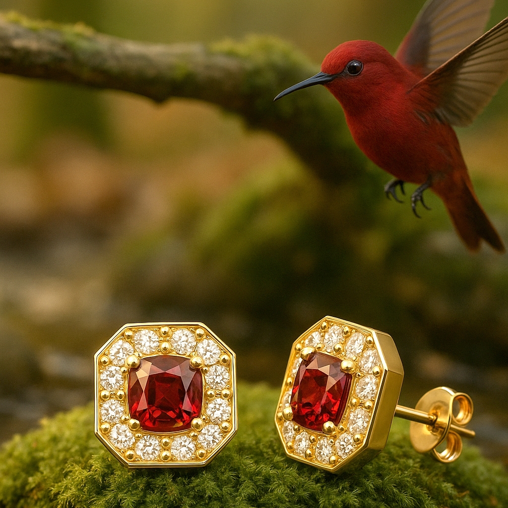 Boucles d’oreilles 750 or jaune 2 rubis 4x6, 2 diamants