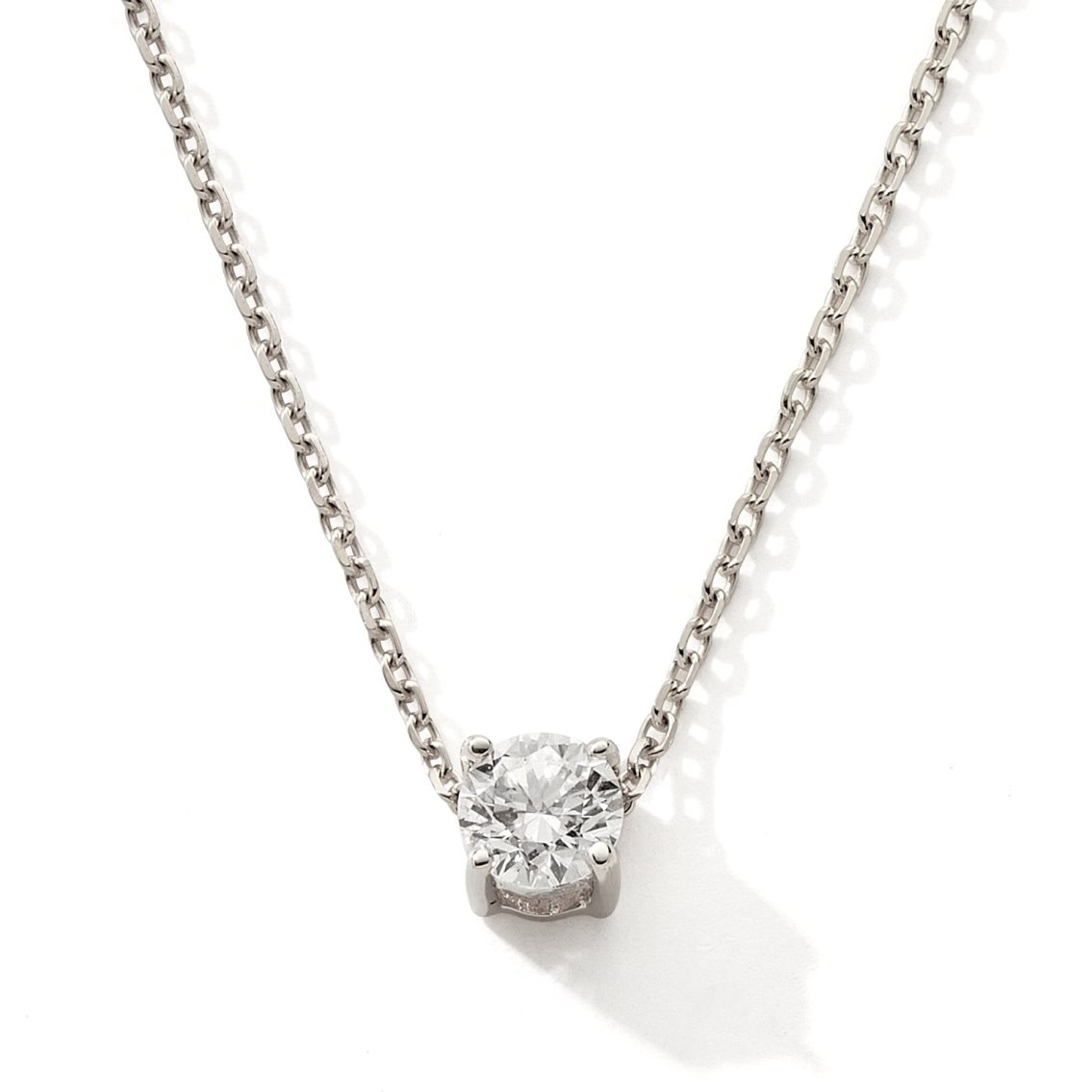 En son centre, un diamant de laboratoire capte la lumière avec une élégance naturelle. Suspendu à une fine chaîne, il semble flotter, apportant une présence discrète et précieuse au décolleté.