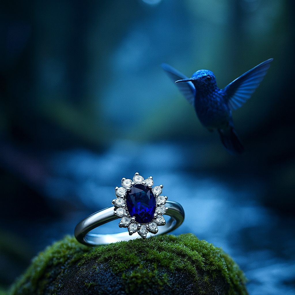 Au centre, un saphir créé par l’homme, taillé en oval 5 × 7 mm, révèle une couleur profonde et veloutée, évoquant le calme d’un ciel nocturne. Son éclat est délicatement souligné par un entourage de diamants de laboratoire, qui apporte lumière et équilibre à la composition.