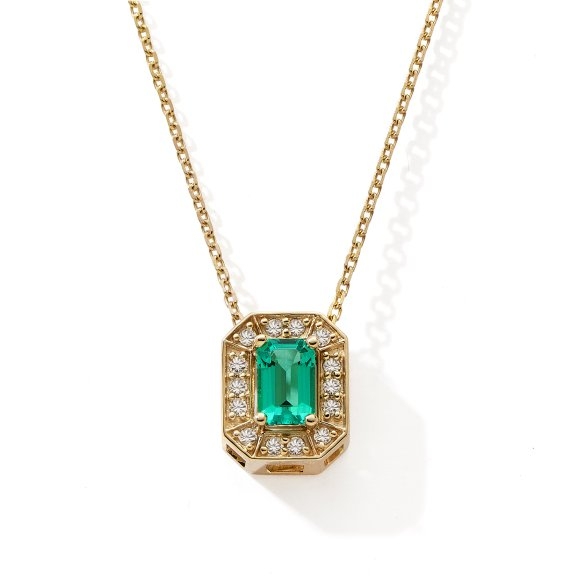 En son cœur, une émeraude créée par l’homme, taillée en rectangle 4 × 6 mm, révèle un vert profond et lumineux, évoquant la fraîcheur d’une nature apaisante. Sa teinte intense capte le regard avec subtilité, tandis que son entourage de 14 diamants de laboratoire souligne la pierre centrale par de délicats reflets, apportant équilibre et harmonie à l’ensemble.