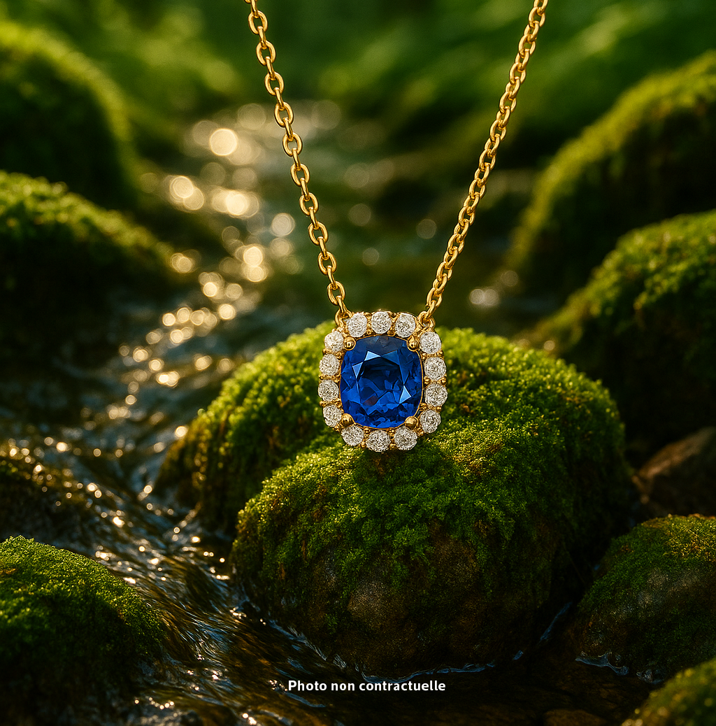 Collier 750 or jaune 1 saphir 7x7, 18 diamants