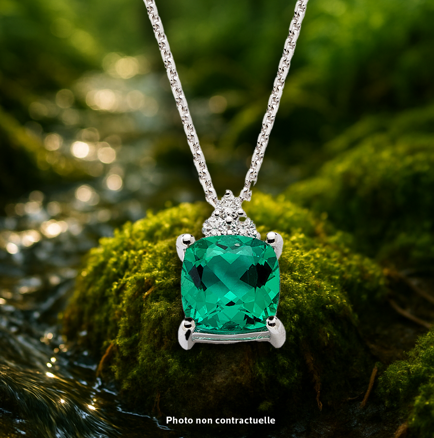 Collier 750 or gris 1 émeraude 7x7, 3 diamants