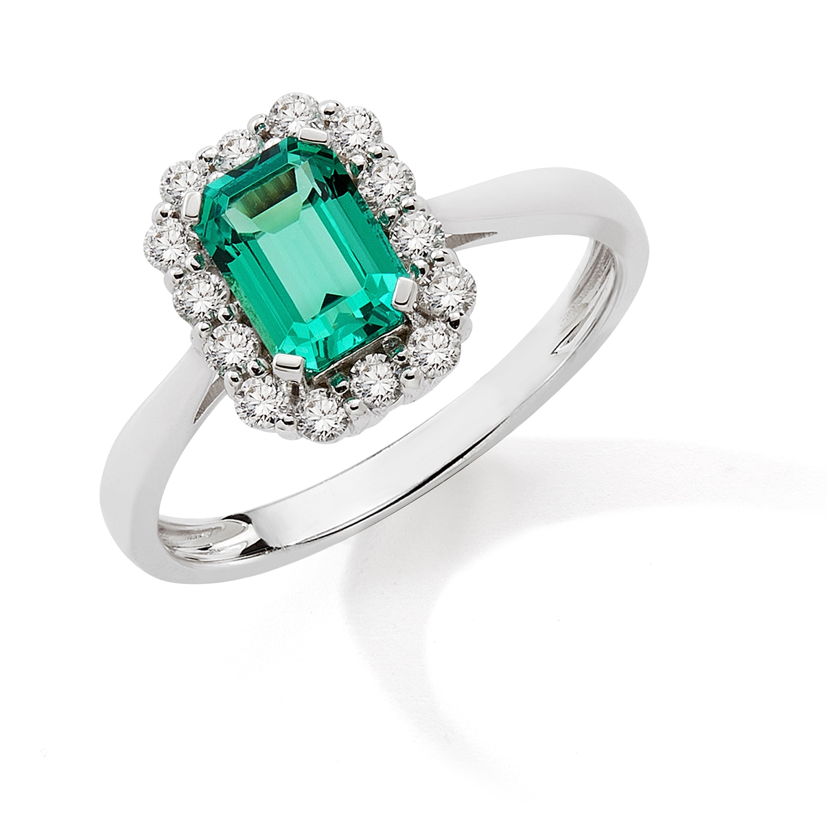 Bague 750 or gris 1 émeraude 5x7, 14 diamants