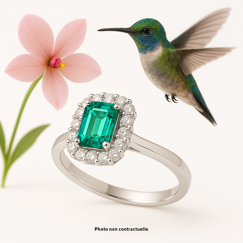 Sertie comme un secret précieux au creux de l’or blanc recyclé, cette bague capture l’essence des légendes les plus anciennes. En son centre, une émeraude de laboratoire taille émeraude (rectangle à pans coupés), de 5x7 mm, irradie d’un vert profond, mystérieux et vibrant.