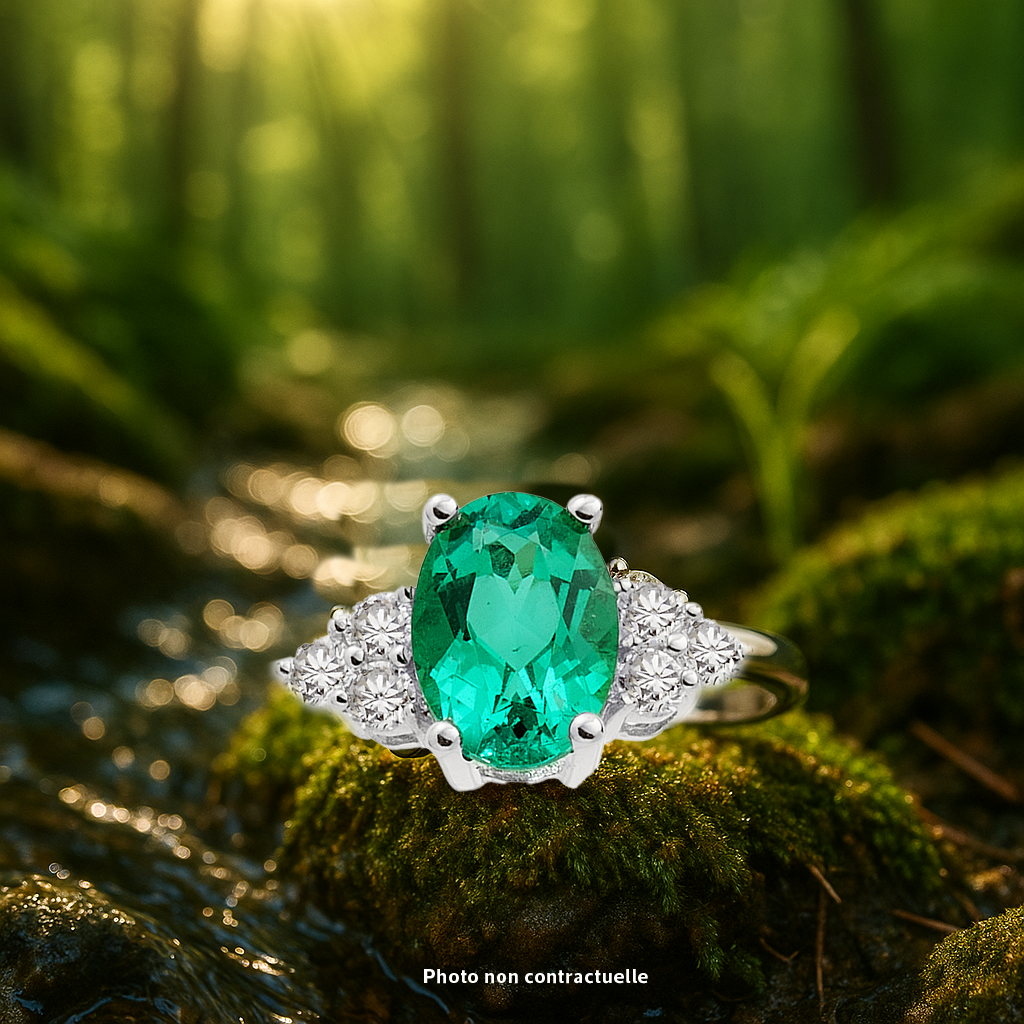 La bague Harmonie dévoile une émeraude de laboratoire taillée en ovale (5x7 mm, 0,75 ct), d’un vert profond et vibrant. Née par la méthode hydrothermale, cette pierre précieuse se forme lentement, à plus de 500°C, au cœur d’un autoclave, imitant à la perfection les conditions naturelles de la Terre.