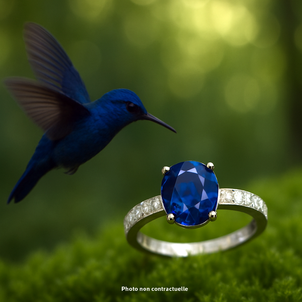 La bague Harmonie affirme son élégance avec puissance et délicatesse. En son centre, un saphir de laboratoire taillé en ovale (7x9 mm, 2,54 ct) déploie ses reflets profonds, empreints de mystère et de noblesse. Issu de la méthode Verneuil, ce joyau bleu intense allie beauté et innovation.