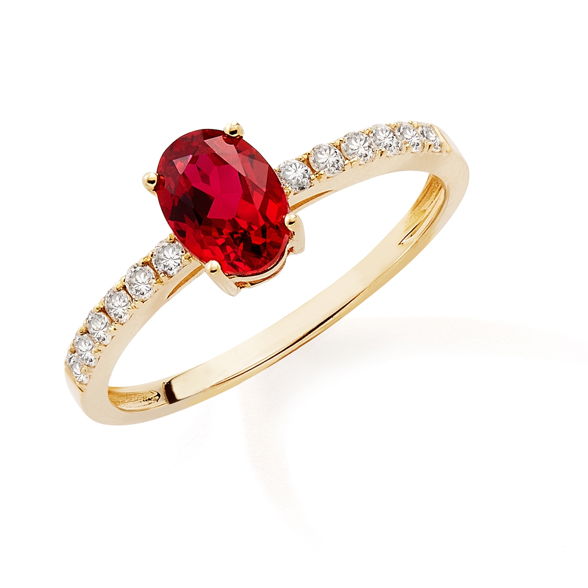 Bague 750 or jaune 1 rubis 5x7, 12 diamants