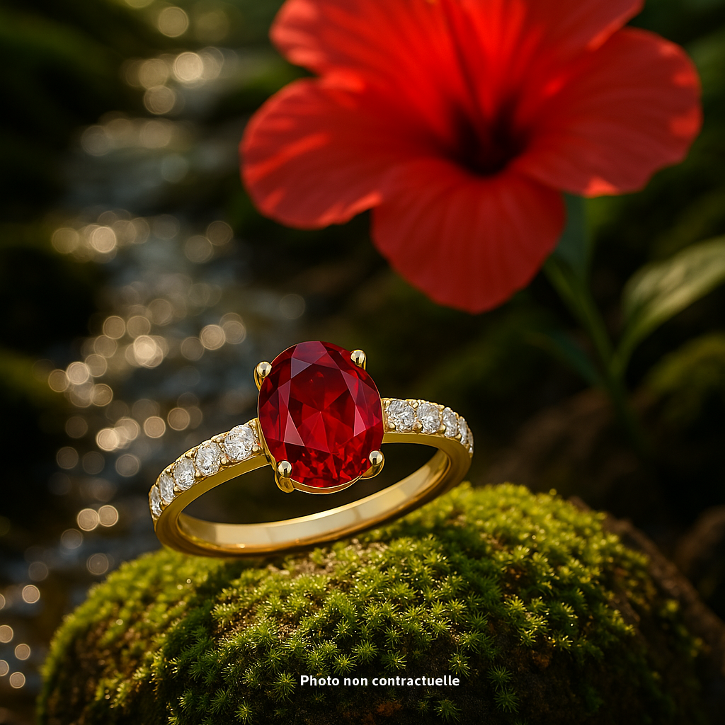 La bague Harmonie unit la passion flamboyante à la lumière pure. En son centre, un rubis de laboratoire d’un rouge profond, taillé en ovale 5x7 mm, semble battre au rythme d’un cœur en éveil. Issu de la fusion de l’alumine et du chrome, ce joyau de 1,08 ct incarne la chaleur des sentiments et la noblesse du geste.