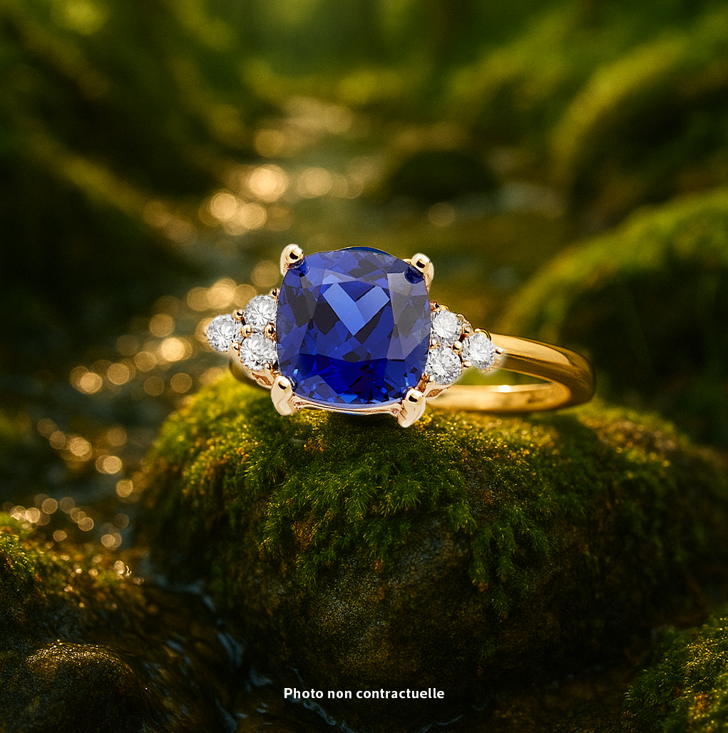 La bague Harmonie incarne la rencontre magique entre intensité et douceur. En son cœur, un saphir de laboratoire taillé en coussin (7x7 mm), d’un bleu profond et velouté, évoque le calme des profondeurs marines et la sagesse intemporelle. Né de la méthode Verneuil, ce saphir de 2,16 ct unit alumine, fer et titane dans une fusion de précision.