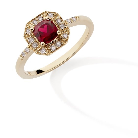 BAGUE OR 375 JAUNE RUBIS COUSSIN (5x5) – 0,84 CT + 16 DTS 0,15 CT