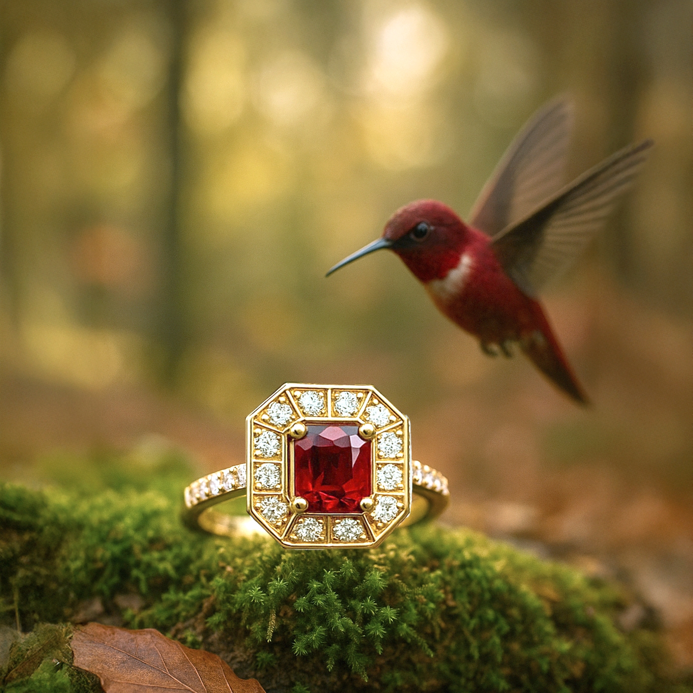 Au centre, un rubis créé par l’homme, taillé en coussin 5 × 5 mm, révèle un rouge profond et vibrant, symbole de passion maîtrisée et d’énergie intérieure. Son éclat est délicatement souligné par un entourage de diamants de laboratoire, qui apporte lumière et équilibre à la composition.