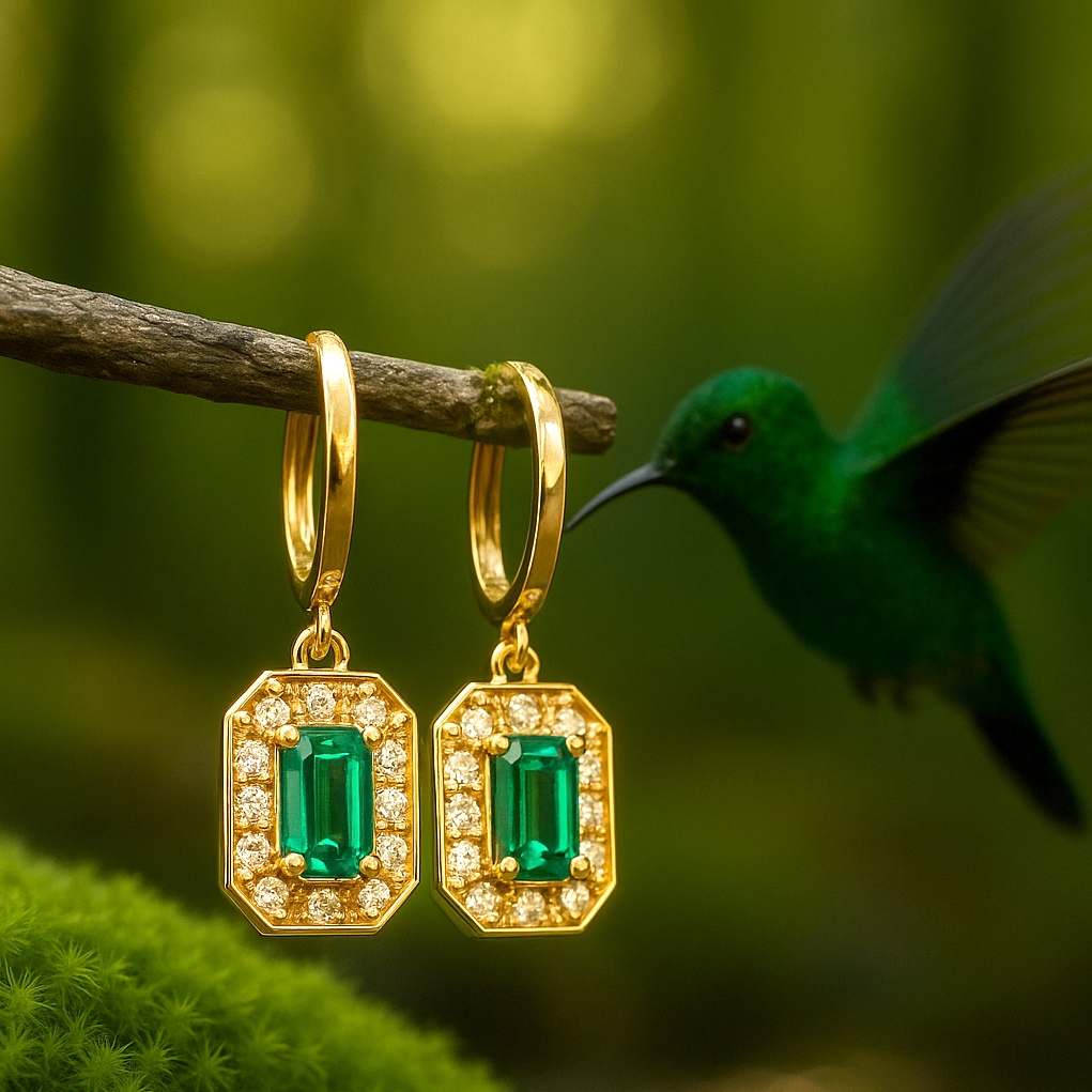 Chaque boucle révèle une émeraude créée par l’homme, taillée en rectangle 3 × 5 mm, dont le vert intense évoque la fraîcheur et l’équilibre de la nature. Serties d’un entourage de diamants de laboratoire, les pierres captent la lumière à chaque mouvement, créant de fins reflets qui soulignent la finesse du bijou.