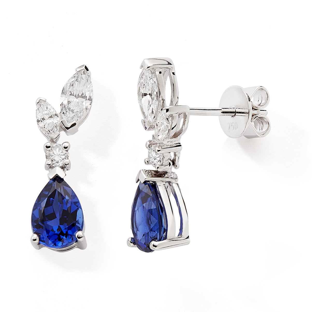 Boucles d’oreilles 750 or gris 2 saphirs 4x6, 28 diamants