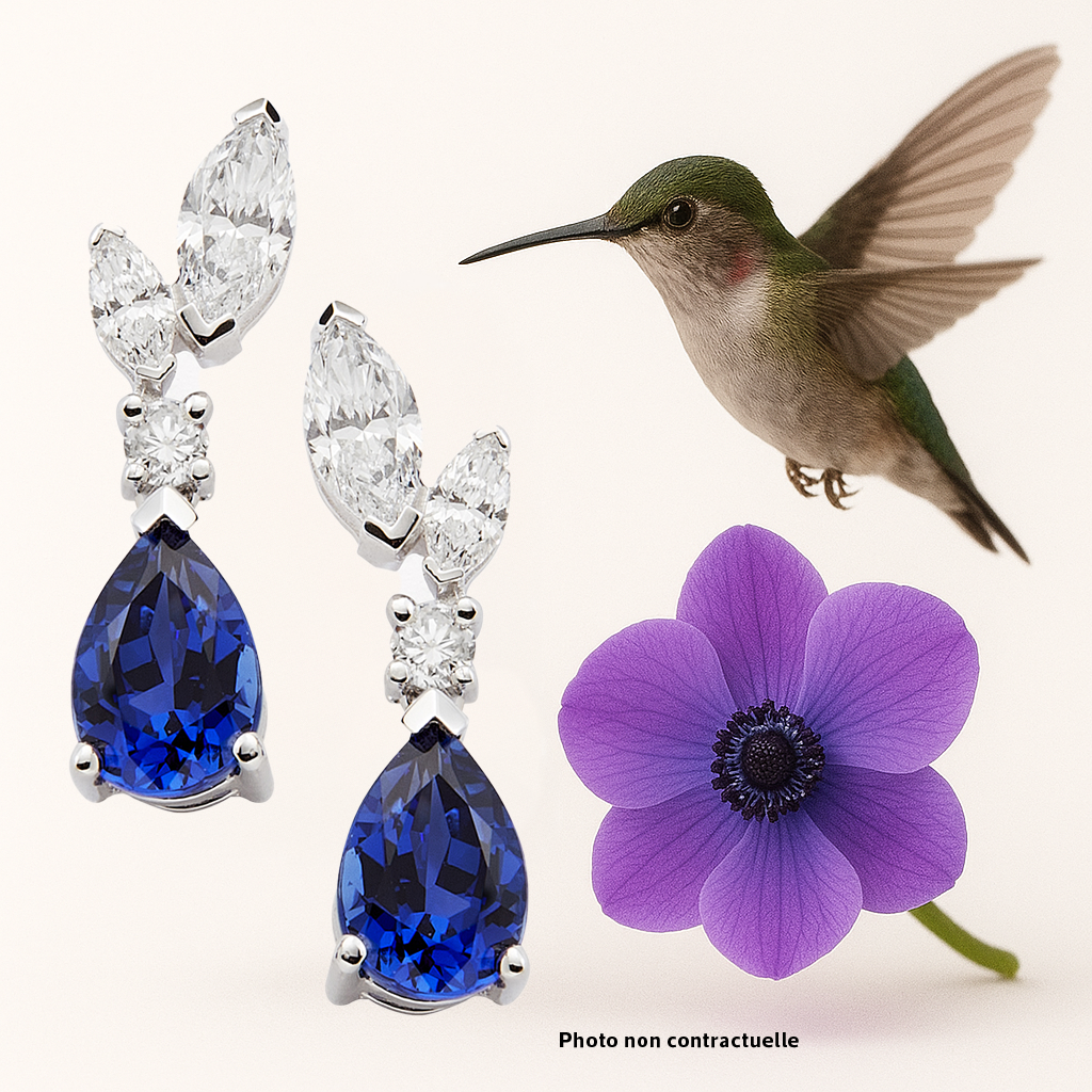 Les boucles d’oreilles Harmonie révèlent une élégance classique sublimée par un design solaire. En leur cœur, deux saphirs de laboratoire ovales (4x6 mm, 1,14 ct au total) déploient la profondeur de leur bleu, évoquant à la fois la force tranquille et l’éclat mystérieux du ciel nocturne.