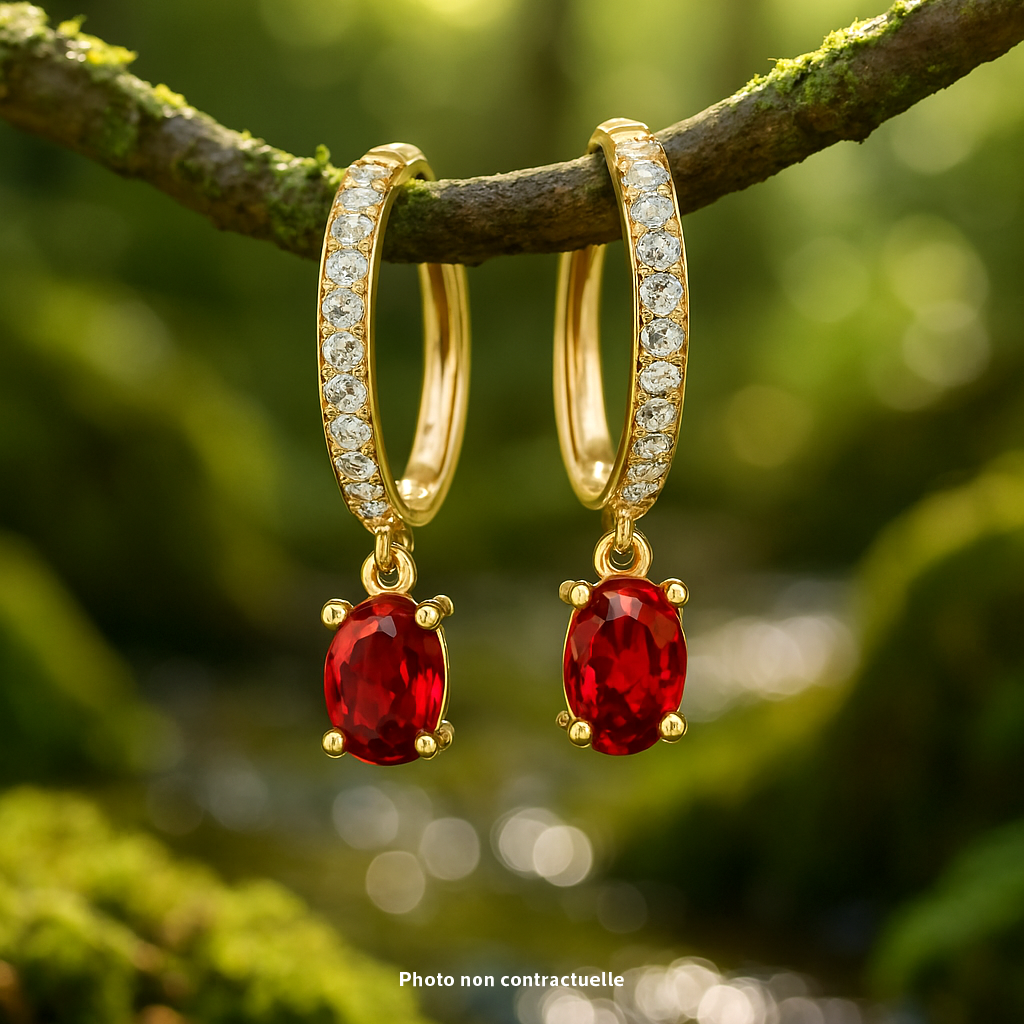 Les boucles d’oreilles Harmonie revisitent le charme des créoles avec une élégance enflammée. Suspendus délicatement, deux rubis de laboratoire taillés en ovale (4x6 mm, 1,04 ct au total) apportent une touche de passion pure à chaque mouvement. Nés d’une alchimie de feu et de savoir-faire, ces joyaux rouge intense rayonnent de chaleur et de raffinement.