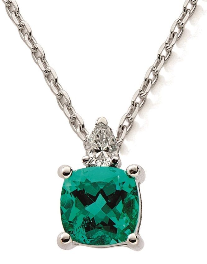 COLLIER OR 375 BLANC EMERAUDE COUSSIN (6x6) – 0,88 CT + 1 DIA POIRE (3x4) 0,15 CT